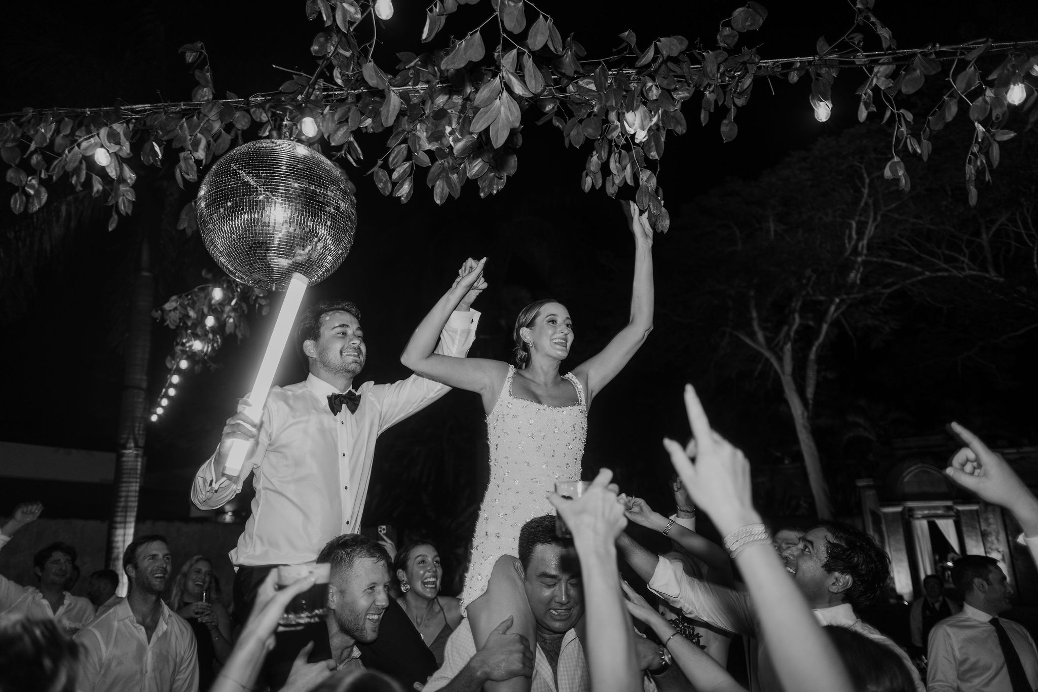 For cocktail hour, guests were greeted with tasty and refreshing cocktails from the locally-loved restaurant and bar Apoala. These cocktails brought a refreshing twist of local flavors to classic drinks. The dinner that followed included a selection of locally inspired cuisine from the Yucatan Peninsula. Their after party went late into the night thanks to the privacy of their hacienda wedding venue, featuring live music from a Cuban brass band.